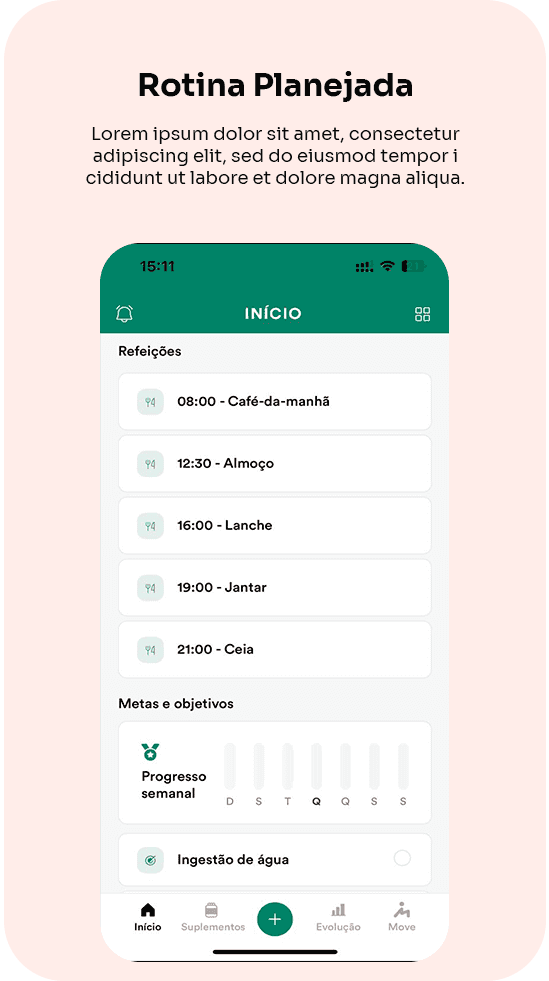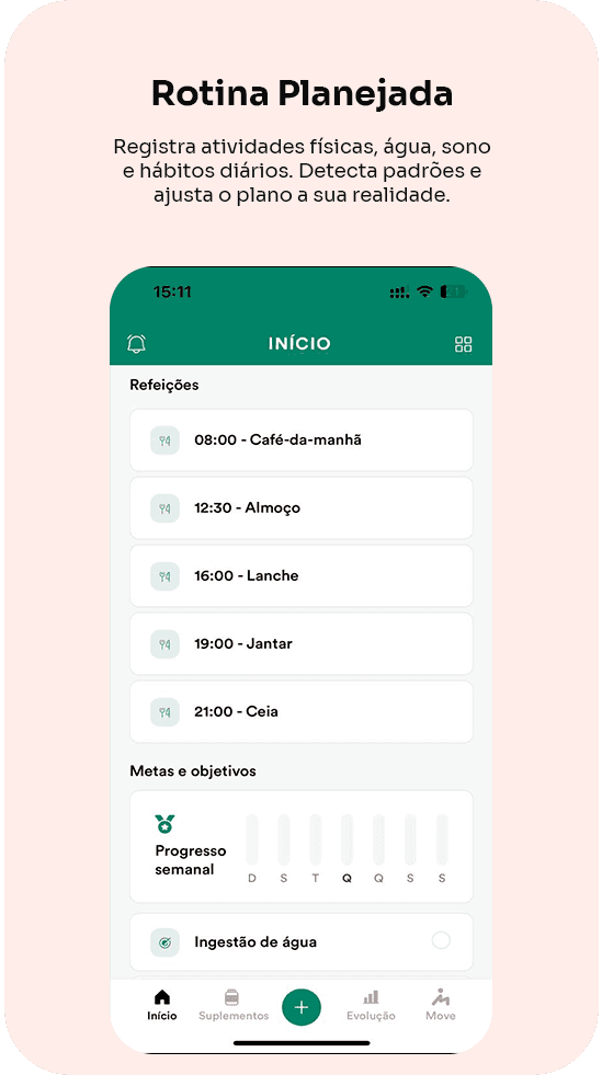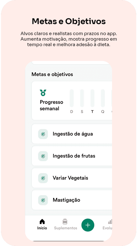 Você acompanha tudo de forma simples e prática: refeições organizadas por horário, substituições fáceis, registro com fotos, rastreamento de macros e calorias em tempo real, lembretes inteligentes e sistema de metas para te motivar e rastrear seu progresso.