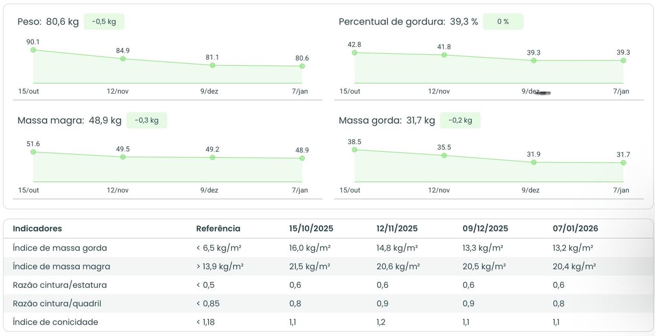 Avaliação precisa: % gordura visceral, massa muscular, metabolismo basal e perímetros. Entenda seu corpo de verdade e acompanhe a evolução real.